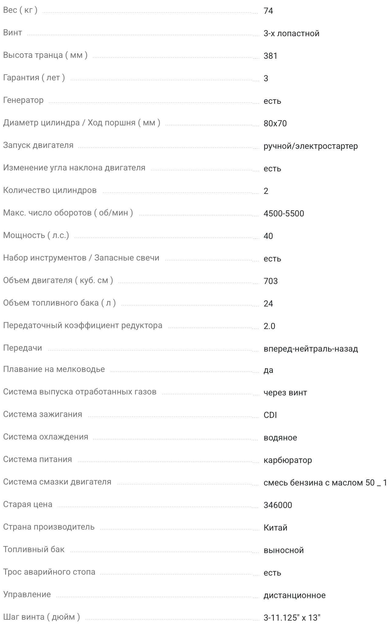 Подвесной лодочный мотор TOYAMA T40FWS-T рассчитан под стандартную высоту транца 381 мм и имеет общий вес 74 кг.
