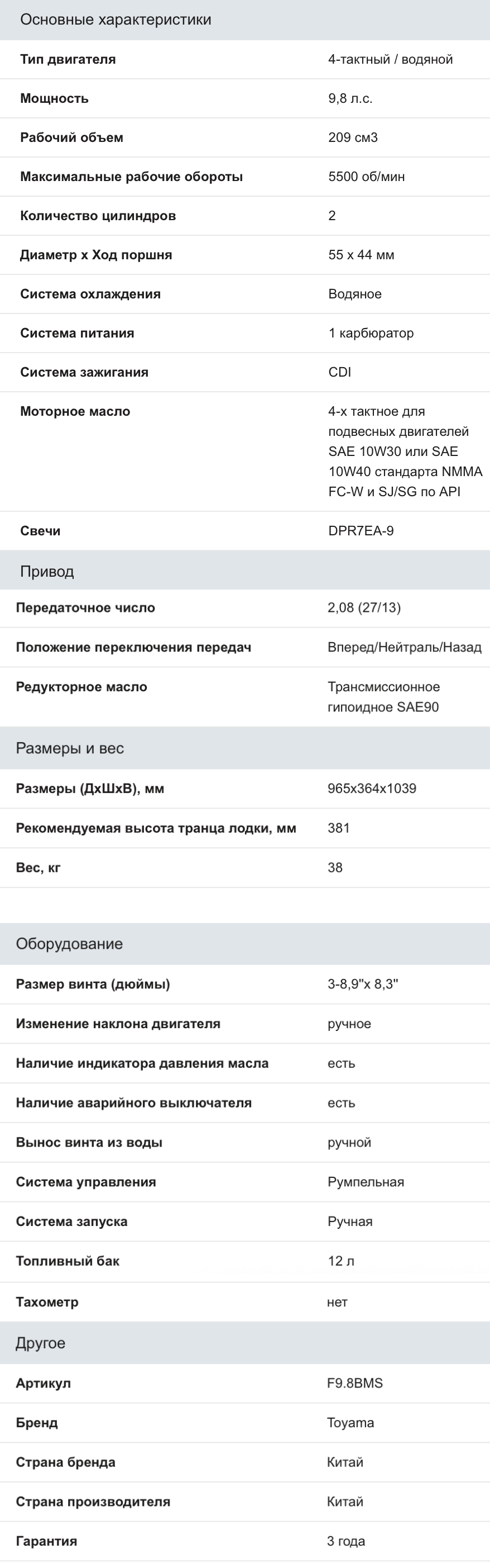 Подвесной лодочный мотор TOYAMA | ТОЯМА 4 такта, 9.8 л.с, (F9.8BMS) - это надежный и мощный мотор для вашей лодки. Он имеет четырехтактный двигатель с объемом 209 см³ и мощностью 9.8 л.с. Он оснащен румпельным управлением, водяным охлаждением, электронным зажиганием и аварийным выключателем. Он также имеет три передачи: вперед, нейтраль и назад, что обеспечивает удобство и безопасность при маневрировании.
